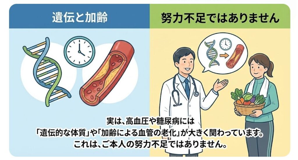 実は、高血圧や糖尿病には「遺伝的な体質」や「加齢による血管の老化」が大きく関わっています。これは、ご本人の努力不足ではありません。