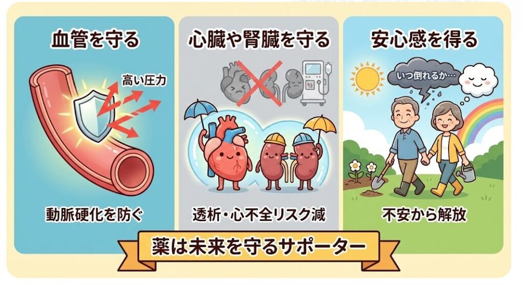 - 心臓や腎臓を守る:臓器へのダメージを最小限に抑え、透析や心不全のリスクを減らします。