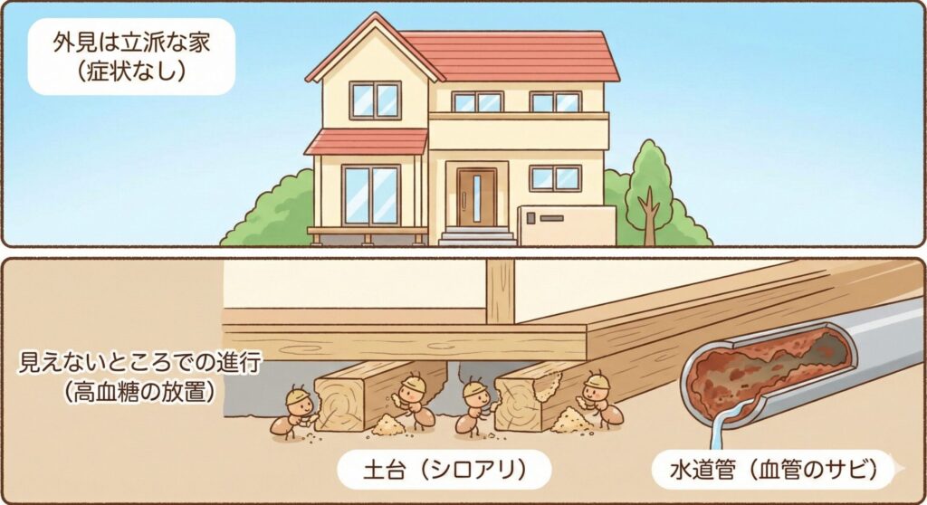 外から見ると立派な家でも、ある日突然、床が抜けたり水漏れしたりするように、糖尿病も「症状が出たときには、すでに合併症が進行している」というケースが少なくありません。