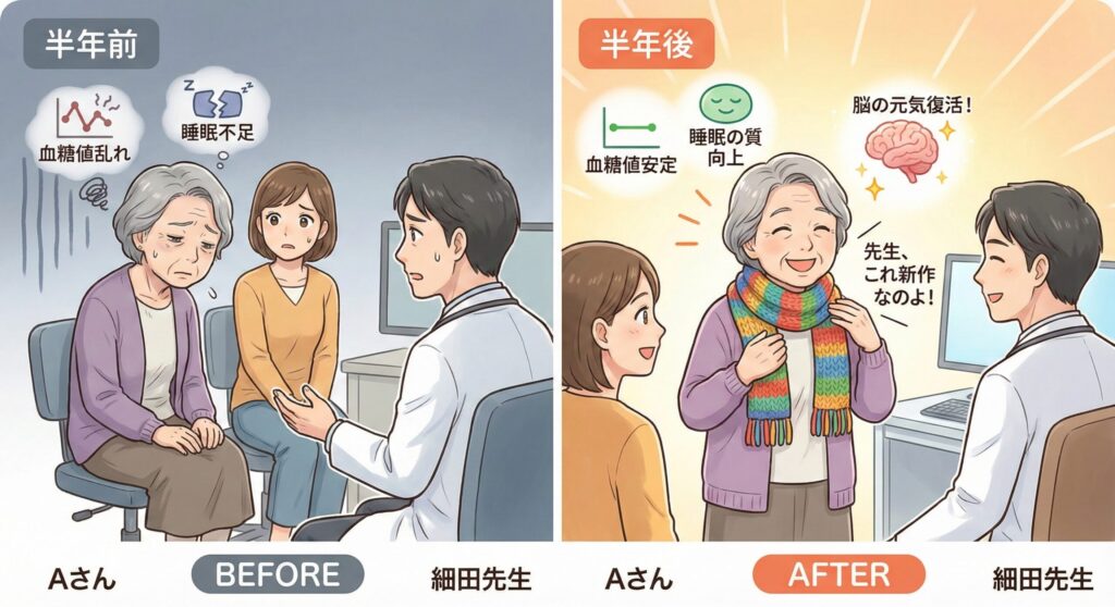 すると半年後、Aさんは診察室に、自分で編んだマフラーを巻いて、笑顔で入ってこられたんです。 「先生、これ新作なのよ」って。 血糖値が安定し、睡眠の質が上がったことで、脳の元気も取り戻されたんですね。あの時の娘さんの安心した顔は、今でも忘れられません。