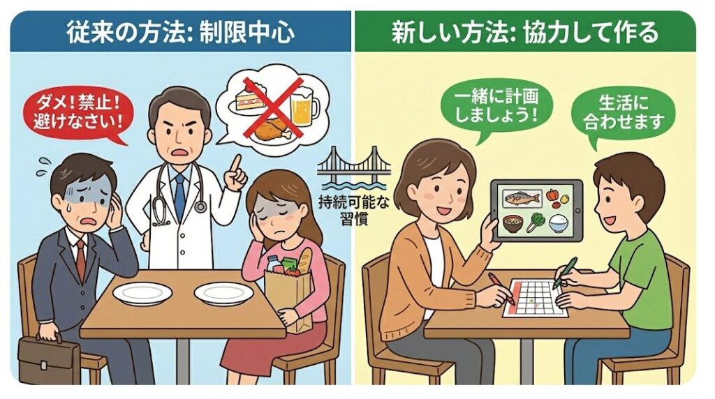 従来の食事指導の多くは、「あれはダメ、これも控えて」という制限中心の内容でした。