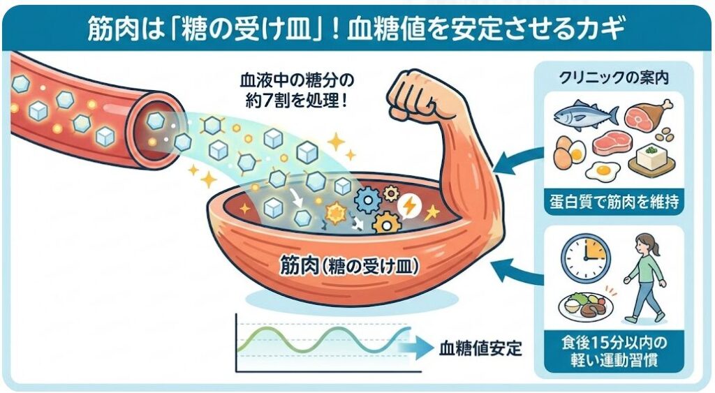 つまり、筋肉という「糖の受け皿」がしっかりしていれば、血糖値は安定しやすくなるのです。