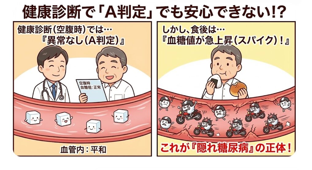 実は、一般的な健康診断で測定する「空腹時血糖値」だけでは、糖尿病の初期段階を見逃してしまうことが多々あります。これを医学的に「食後高血糖(グルコーススパイク)」と呼び、いわゆる「隠れ糖尿病」の正体です。