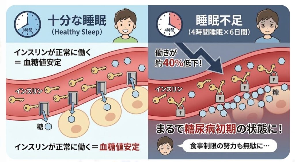 シカゴ大学の研究によると、健康な若者に「1日4時間睡眠」をたった6日間続けてもらったところ、血糖値を下げるホルモンであるインスリンの働き(糖代謝能力)が約40%も低下し、まるで糖尿病初期のような状態になったというデータがあります(※コメ1)。